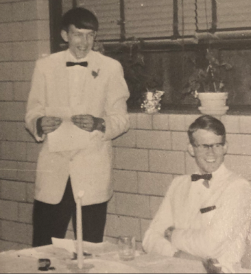 For the next Homecoming Dance during my senior year, we hit Louie’s (now Scudzy’s) in Newport for a beer before picking up our dates. Back then in Ohio it was legal at age 18 to purchase beer with 3.2% alcoholic content; however, because of basketball training rules, I unfortunately could not partake. However, fast forward to the Prom later in the Spring after basketball season was over, we again went to Louie’s between the Prom banquet and the dance. Louie, knowing that we were all seniors, brought out a bottle of “aged” cherry vodka for a toast to the occasion. Note that we were all wearing white prom jackets as shown in this photo of me and a classmate Frank during the banquet. Had the photo been taken later at Louie’s or the dance, you would have seen a streak of bright red cherry vodka that has spilled down the front of my jacket during one of the infamous Louie toasts! Fortunately, the dry cleaner was able to get out the stain as the jacket had been borrowed from a fellow classmate’s older brother.